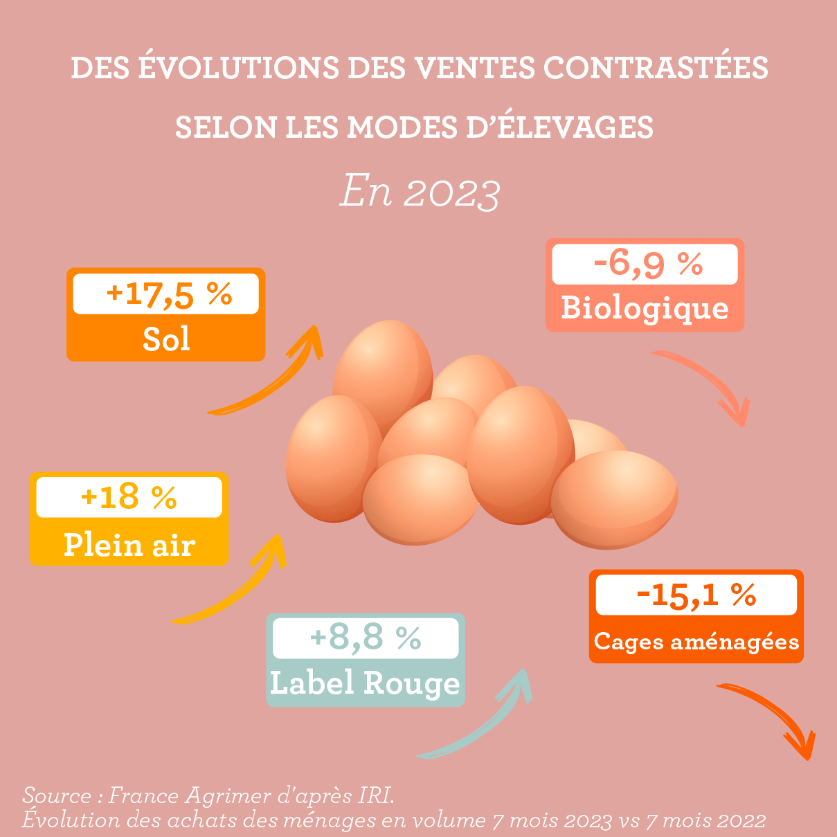 Sur la période janvier-juillet 2023 par rapport à janvier-juillet 2022, les achats d’œufs issus des élevages au sol progressent en volume de +17,5 %, au même niveau que le plein air (+ 18 %). Les achats d’œufs Label Rouge enregistrent quant à eux une hausse à +8,8 %.
