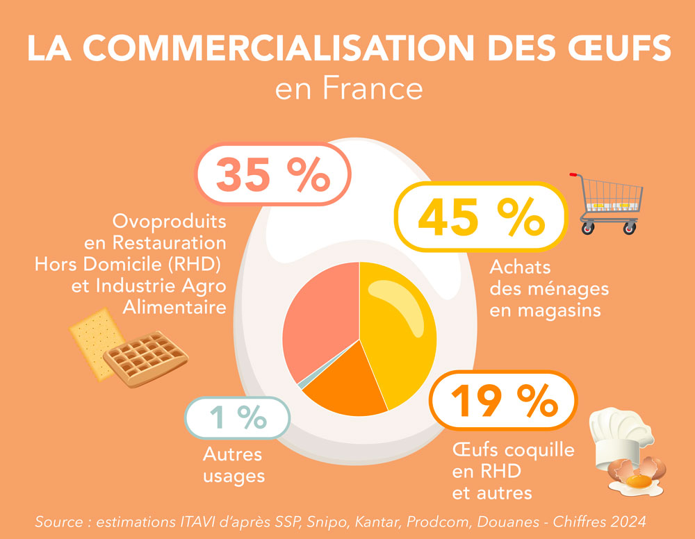 Dans cette consommation, la part des ovoproduits s’élève à 35 %, les œufs coquilles utilisés en restauration hors domicile et autres à 19 % et, enfin, les achats des ménages en magasin à 45 %.