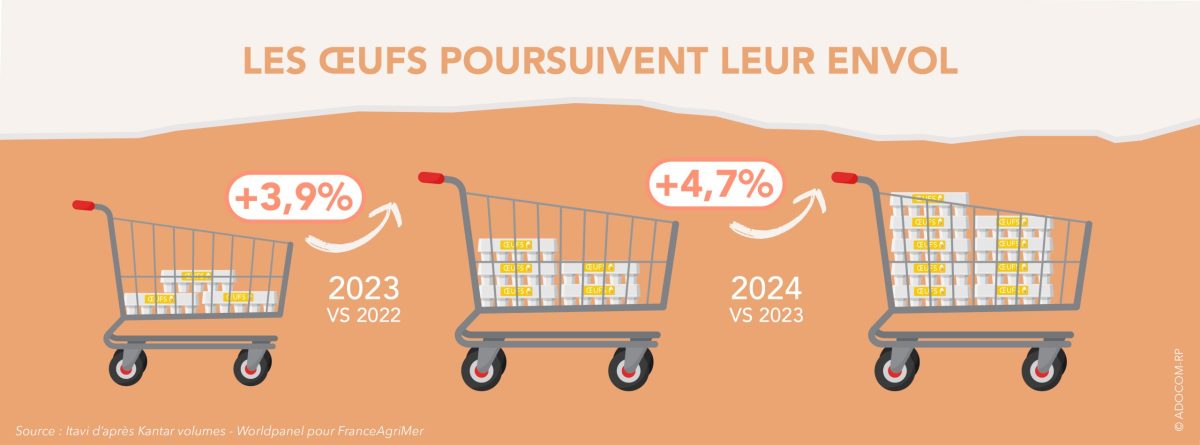 Sur l’année 2024, les achats des ménages ont augmenté de + 4,7% en volume par rapport à 2023, tirés par la hausse des achats d’œufs de poules élevées au sol (+ 6,9 %) et de plein air (+ 8,1 % hors Label Rouge). En 2023, cette hausse était déjà de +3,9 % sur 1 an.