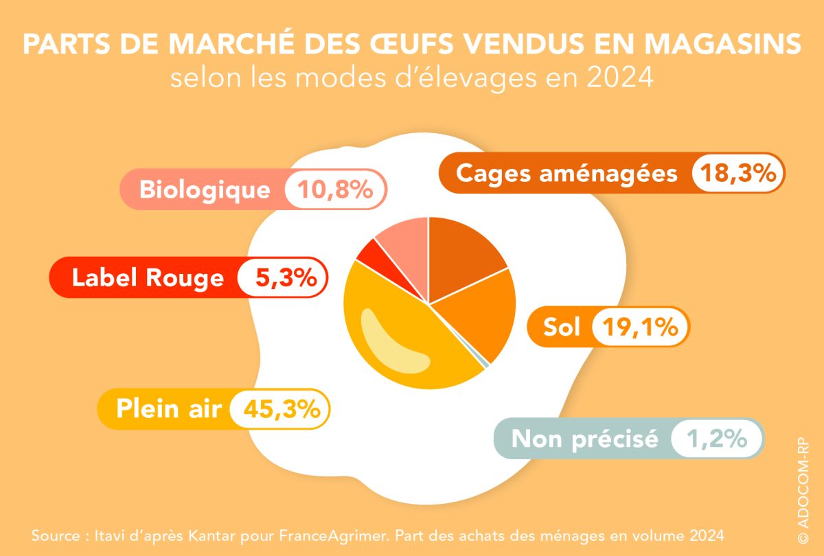 Les œufs de Plein air (hors Label Rouge) arrivent en première position de cette catégorie, à 45,3 % de part de marché en 2024, suivis des œufs issus de poules élevées au sol (19,1 %) puis des œufs bio (10,8%) et des œufs Label Rouge (5,3%).