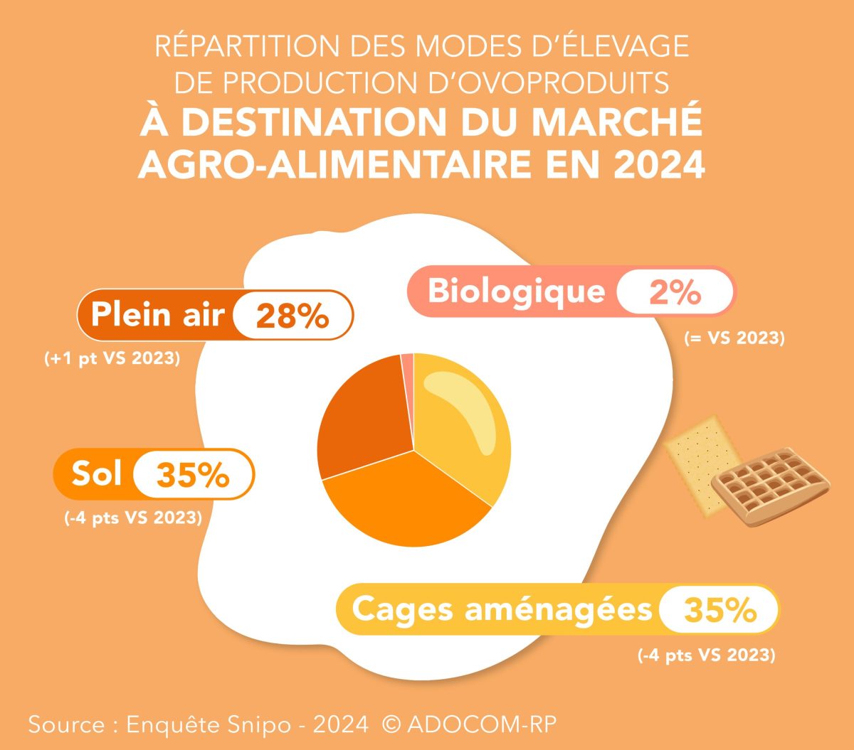 Sur le marché des entreprises agroalimentaires et de la Restauration Hors Domicile, la production d’ovoproduits à partir d’œufs de poules élevées en cages aménagées est minoritaire depuis 2022.