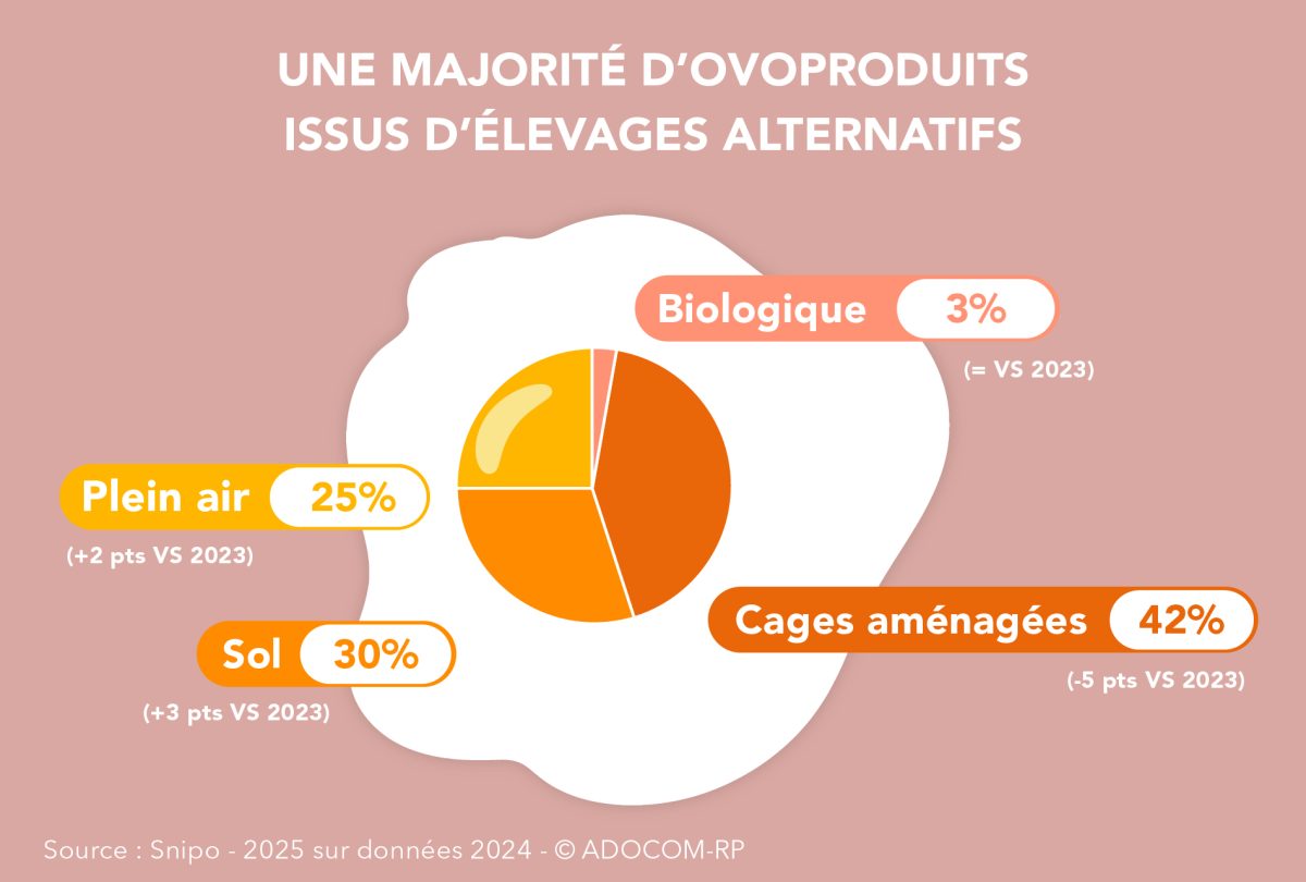 Les ovoproduits sont donc majoritairement fabriqués à partir d’œufs issus d’élevages alternatifs à 58 % (53 % en 2023).