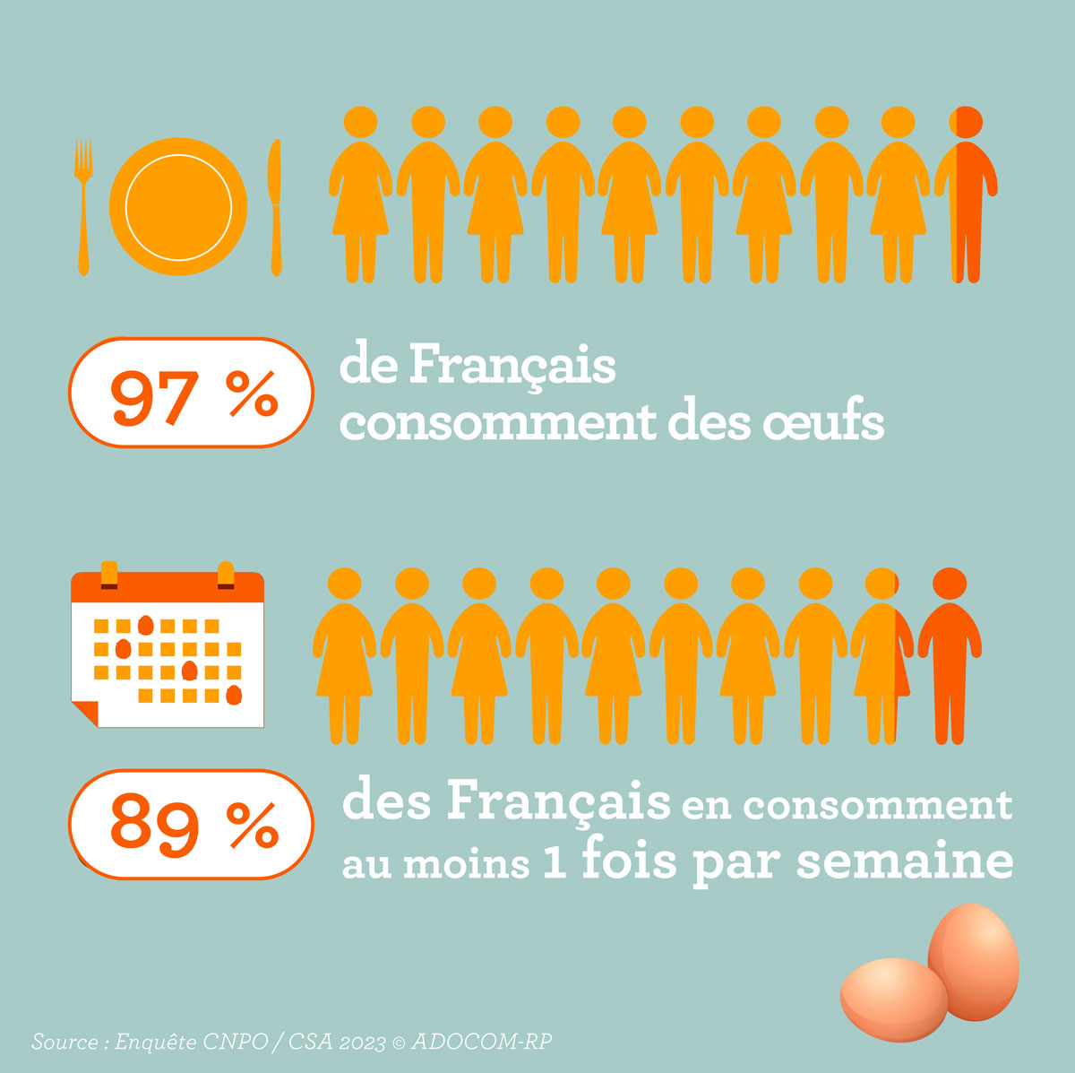 Les œufs sont devenus indissociables du quotidien des Français. D’après la dernière enquête menée par l’Institut CSA pour le CNPO, la quasi-totalité des Français – 97 % – déclare consommer des œufs. Ils sont au menu de près de 9 consommateurs sur 10 (89 %) au minimum une fois par semaine. Les Français sont même 54 % à en consommer plusieurs fois par semaine : 8 % disent en consommer tous les jours ou presque et 46 % entre deux et quatre fois par semaine.