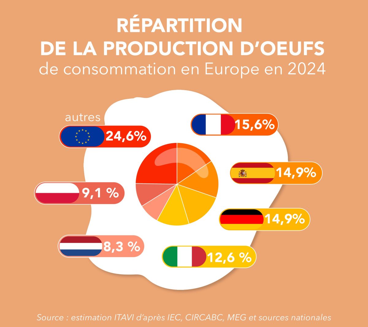 Le pays confirme ainsi sa 1re place des pays producteurs d’œufs de l’Union européenne, qu’il avait retrouvé en 2023, devant l’Espagne et l’Allemagne. Ces deux pays arrivent à égalité sur la 2e marche du podium, devant l’Italie qui est en 4e position.